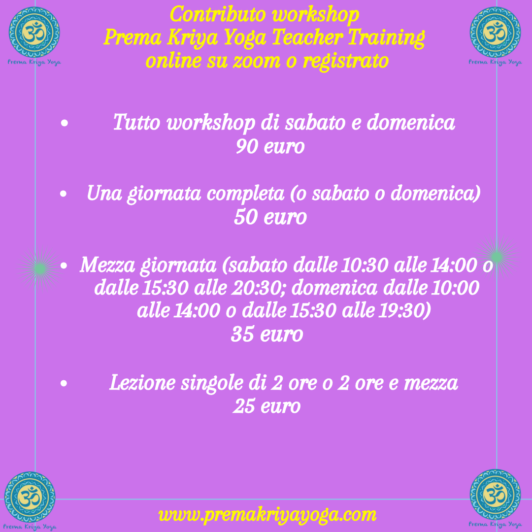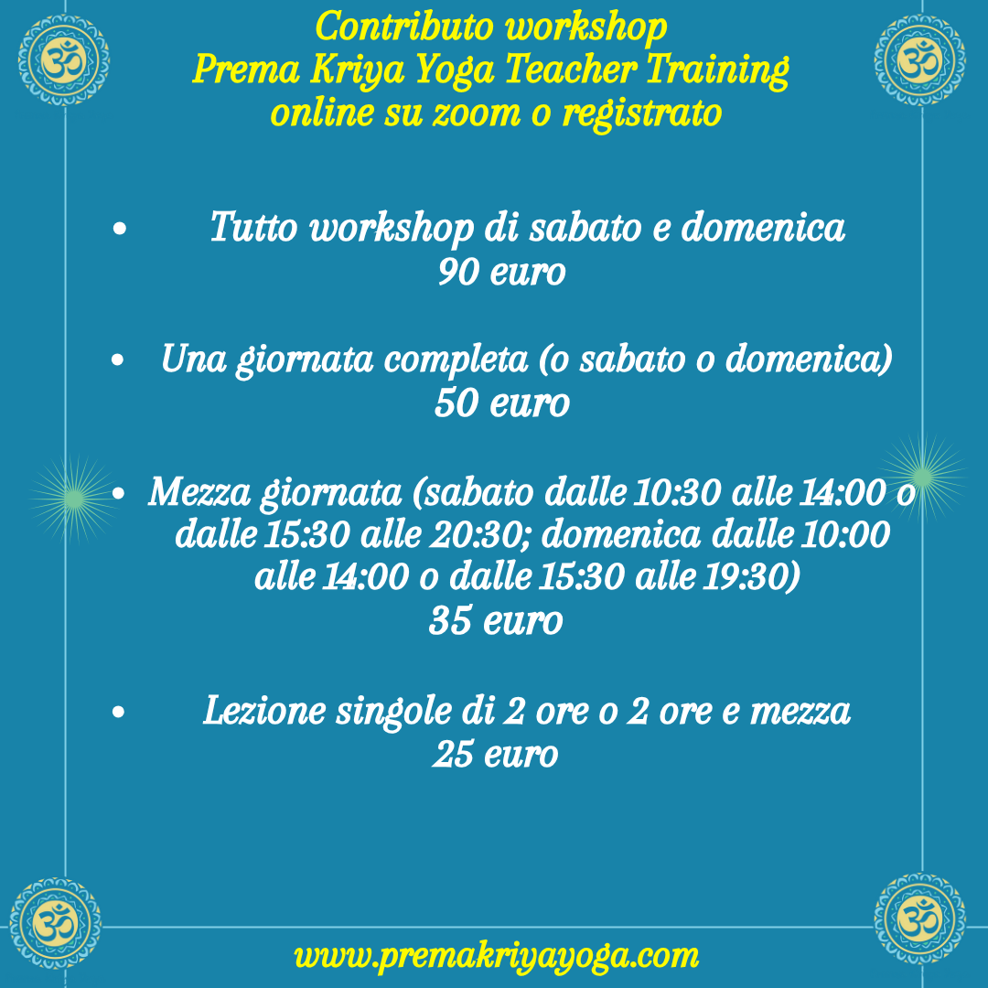 Per chi fosse interessato, per ricevere tutte le registrazioni, per favore, mandate il vostro contributo tramite PayPal (all’indirizzo e-mail premakriyayoga.com@gmail.com) o effettuare un bonifico a Unicredit banca, Iban: IT32G 02008 01422 000103840080.